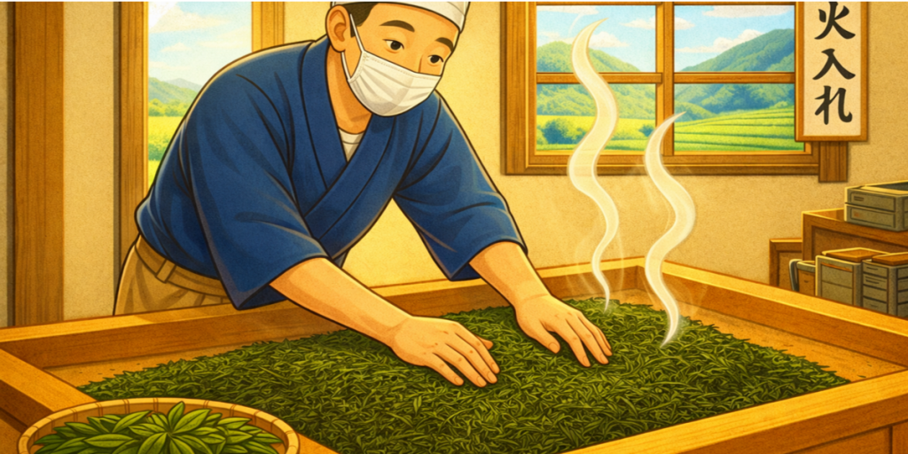 厳しい冬を乗り越えるために肉厚になった茶葉を、高温でじっくりと乾燥・焙煎させる伝統的な工程のこと。これにより、茶葉本来の甘みが凝縮され、独特の香ばしい香りが生まれます。